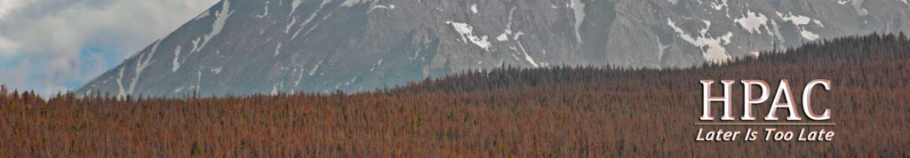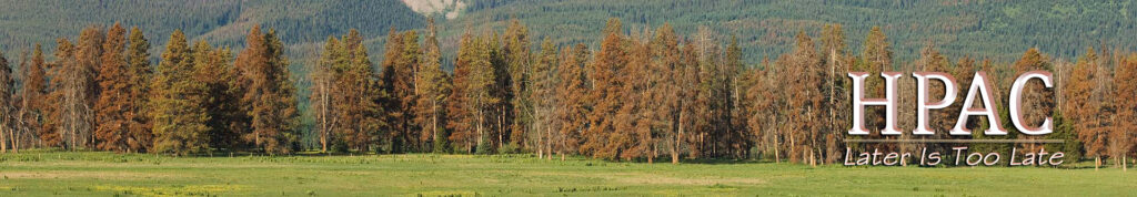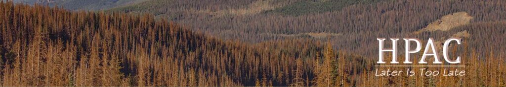 Red kill, lodgepole pine (Dendroctonus ponderosae) Central Colorado north of Silverthorne on I70. Over 100,000 million acres in western North America have been killed by native bark beetles since the turn of the century. The cause is water stress from warming. This continental-scale attack is now waning as the mountain pine beetle has destroyed almost all large stands of its preferred hosts of ponderosa and lodgepole pine. Beginning about 2015, attacks from native fir and spruce beetles began ramping up and are now comparable to the worst of the mountain pine beetle’s attack.