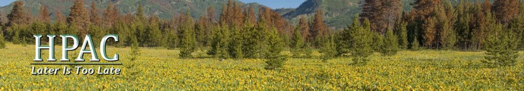 Steamboat Lake State Park, near Steamboat, Colorado. A field of alpine sunflowers set against an extreme mountain pine beetle kill in lodgepole an ponderosa pine.
