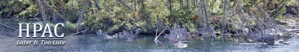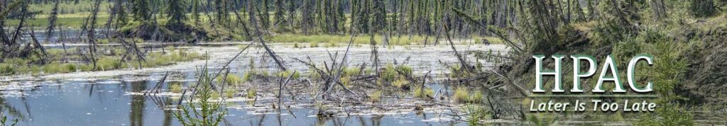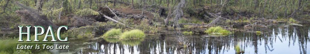 Permafrost Thaw, Glenn Highway, Alaska. Most permafrost is mostly ice. When it melts, it creates lakes with drowned vegetation. Sometimes the lakes drain away leaving bombshell-pockmarked landscapes. Sometimes they remain lakes. All emit fossil greenhouse gases in large quantities when thawing and thawing has just begun. Most is extremely deep with depths up to a half mile in Alaska and a mile in Russia.