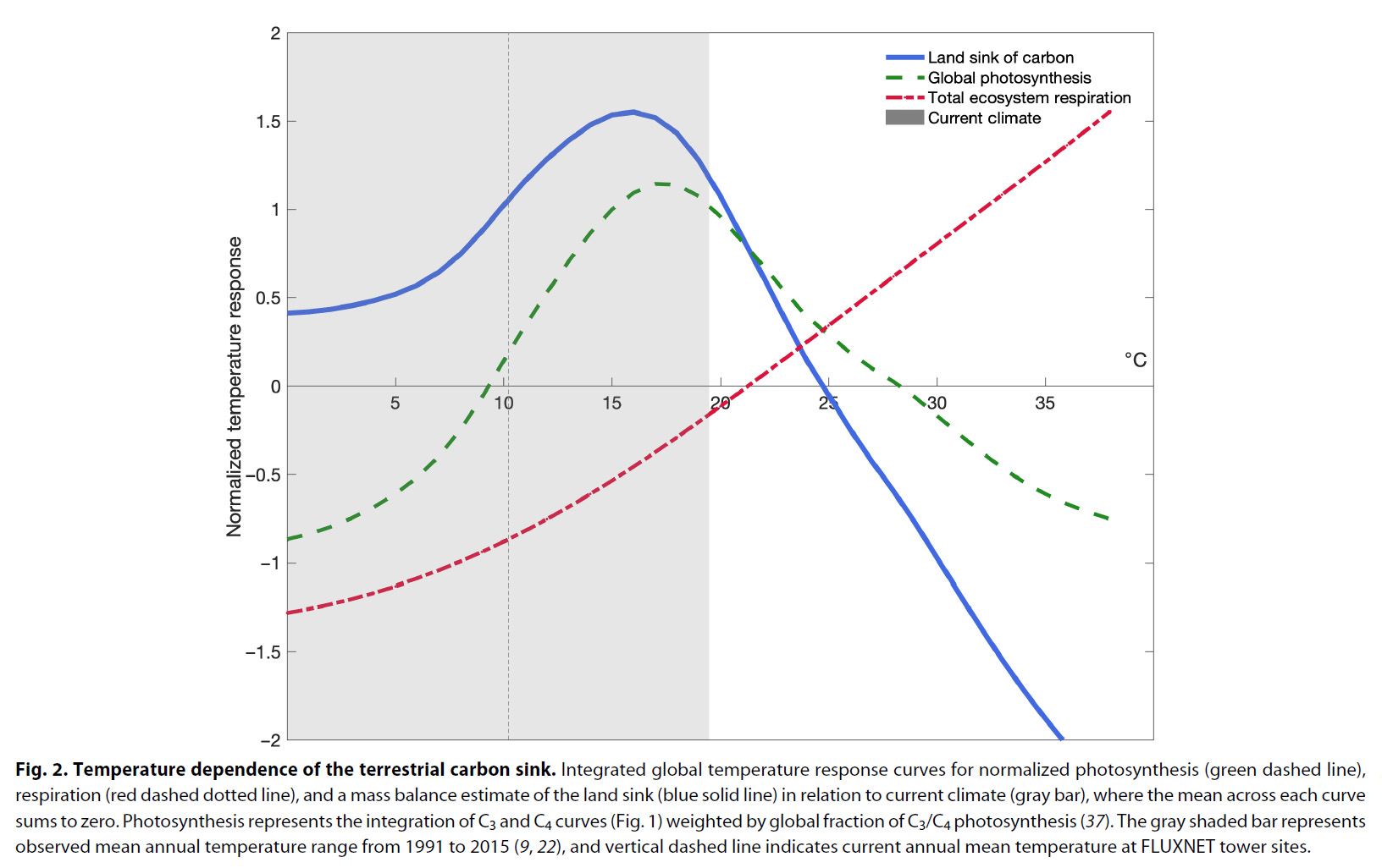 “The temperature dependence of global photosynthesis and respiration determine land carbon sink strength.While the land sink currently mitigates ~30% of anthropogenic carbon emissions, it is unclear whether this ecosystem service will persist and, more specifically, what hard temperature limits, if any, regulate carbon uptake. Here, we use the largest continuous carbon flux monitoring network to construct the first observationally derived temperature response curves for global land carbon uptake. We show that the mean temperature of the warmest quarter (3-month period) passed the thermal maximum for photosynthesis during the past decade. At higher temperatures, respiration rates continue to rise in contrast to sharply declining rates of photosynthesis. Under business-as-usual emissions, this divergence elicits a near halving of the land sink strength by as early as 2040.”