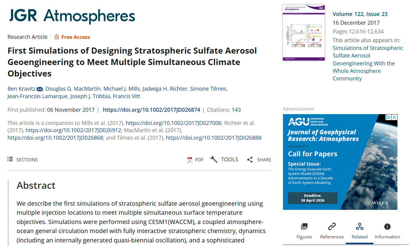 Kravits, McMartin et al., First Simulations of Designing Stratospheric Sulfate Aerosol Geoengineering to Meet Multiple Simultaneous Climate Objectives.